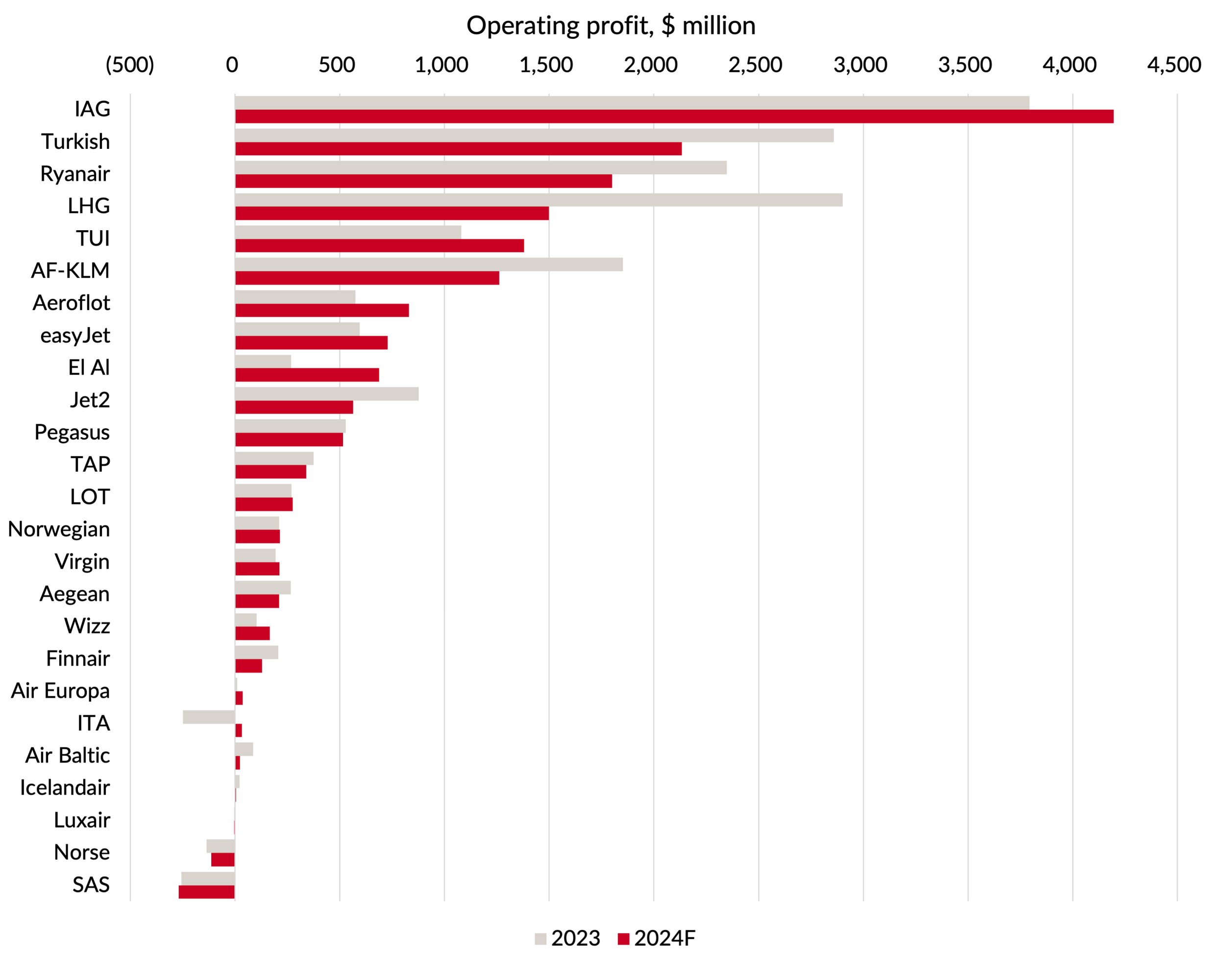 I won’t bore you with all the detail of net profit by airline, since it tells a similar story. I will point out that through a combination of being both very big and very profitable, IAG, Turkish Airlines and Ryanair between them account for more than half (57%) of expected net profits for the European region in 2024.