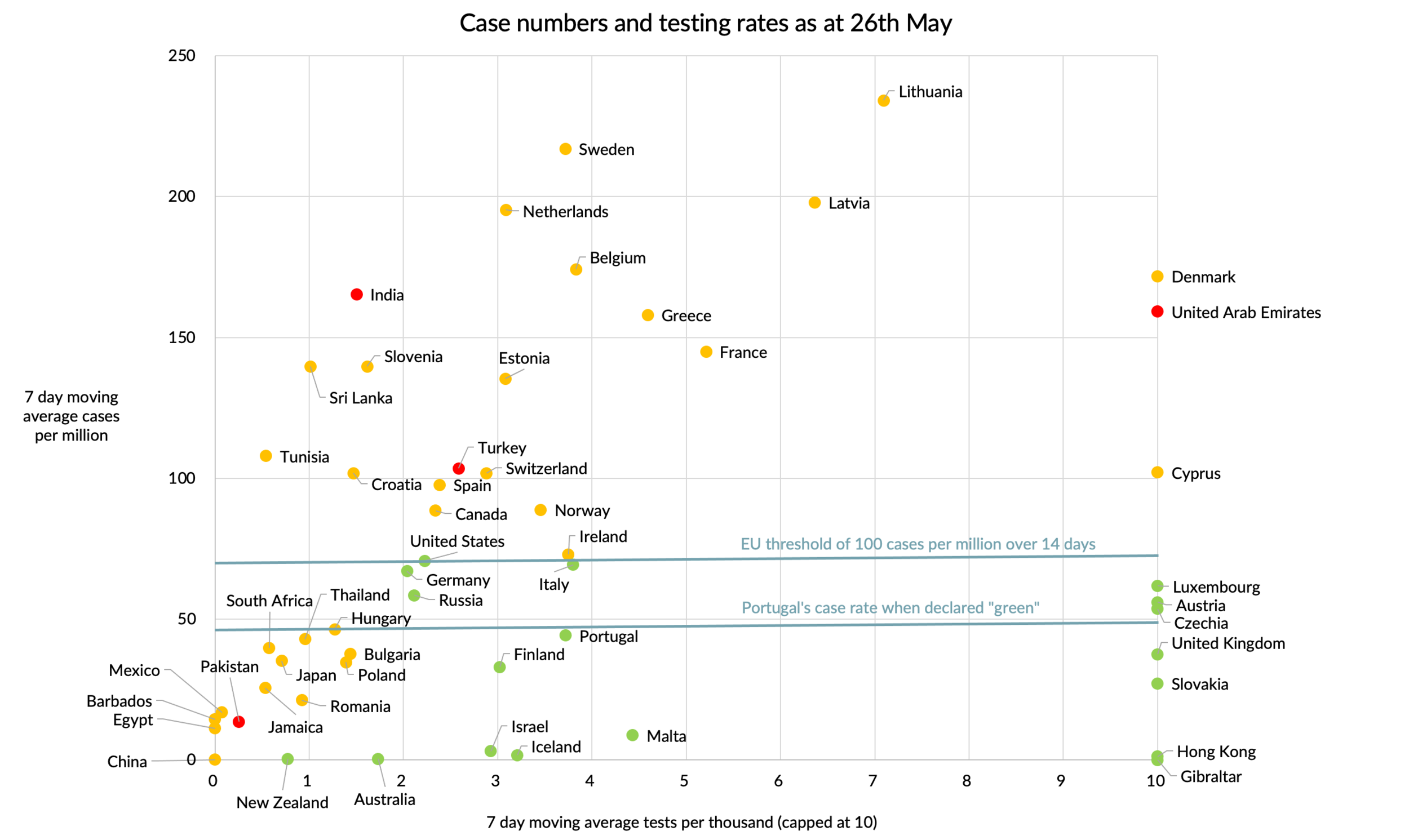 Why did I choose 71 per million as a case rate threshold? It is the equivalent of the EU’s proposed threshold of 100 cases in a 14 day period per 100,000 population. We don’t know whether the UK government is using that threshold, or something lower. So I’ve also shown the case rate that Portugal had when the government put it on the green list. So somewhere between the two lines is presumably an acceptable rate.
