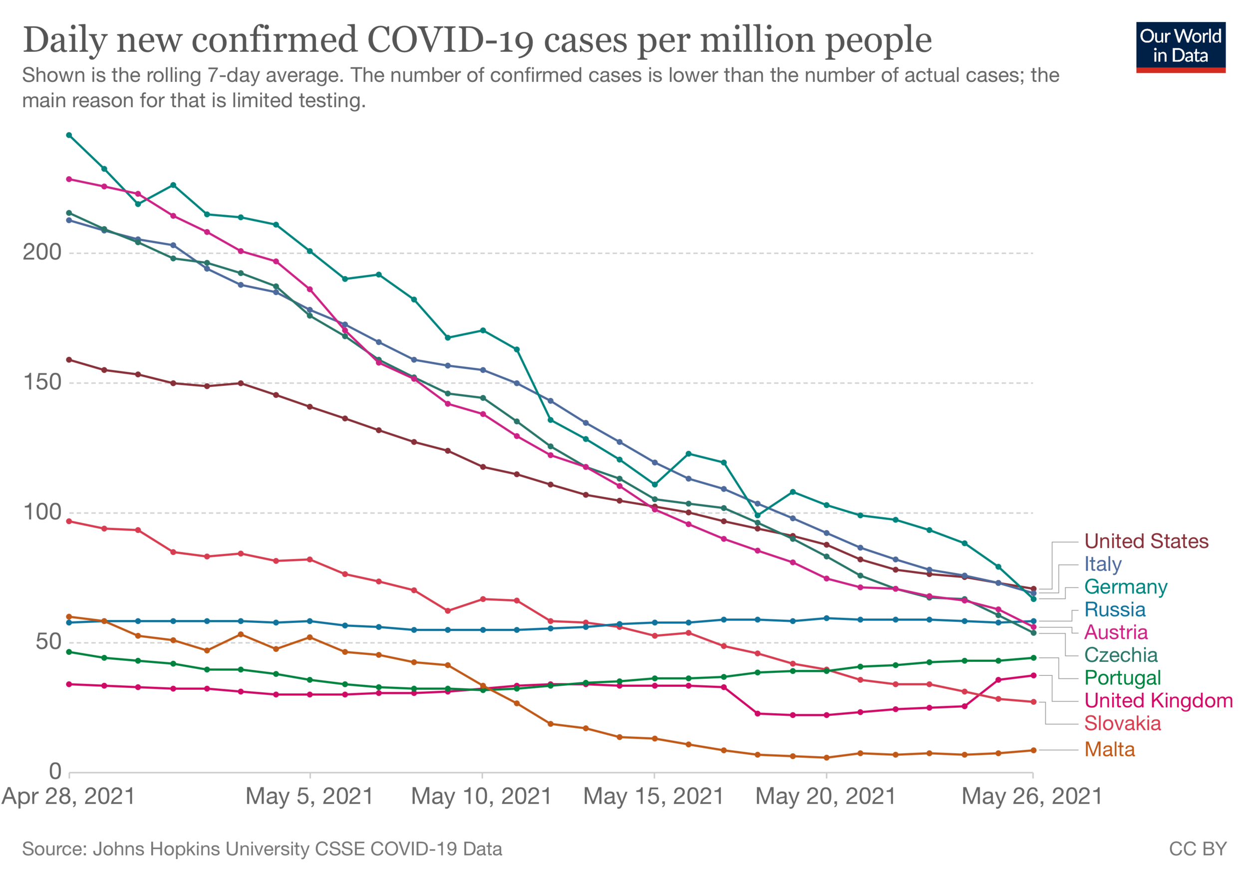 If the announcement happens on June 1 and the lag hasn't been reduced, then the assessments will be based on data from three days earlier than the figures I’ve used. That matters because the case rates for most of my green list candidates have been falling continually, as you can see from the following chart. That might mean countries like Germany, Italy and especially the United States “miss the bus” and have to wait another three weeks to catch the next one.
